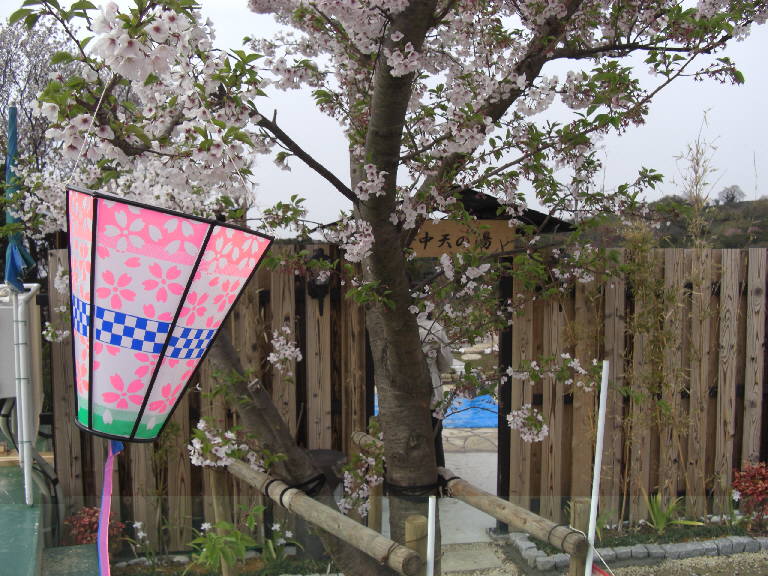 | ・・・・大きな花壇にはバラとチューリップを植えています。今年の畑にはジャガイモを植えました。意外と好評な足湯です。 | ||||