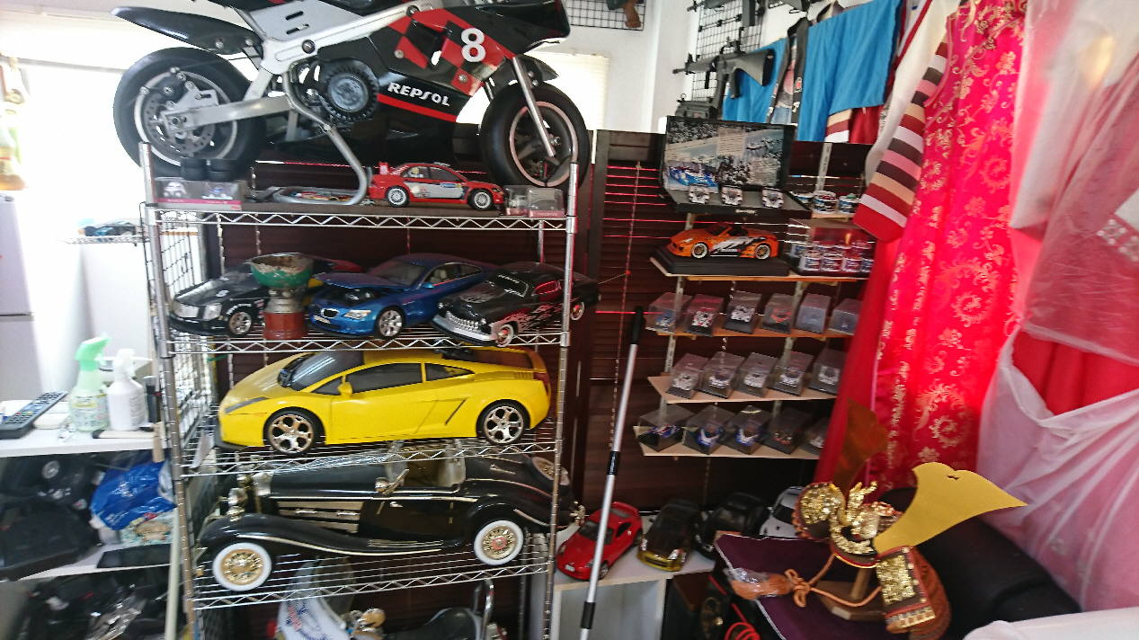 | ・・・2階にはケヤキの一枚板で作ったテーブルや趣味のピアノ、現地で買ってきた民族衣装やラジコン、フィギィア、エアーガン、森伊蔵などの高級な焼酎を収集して飾っています。 | |||||